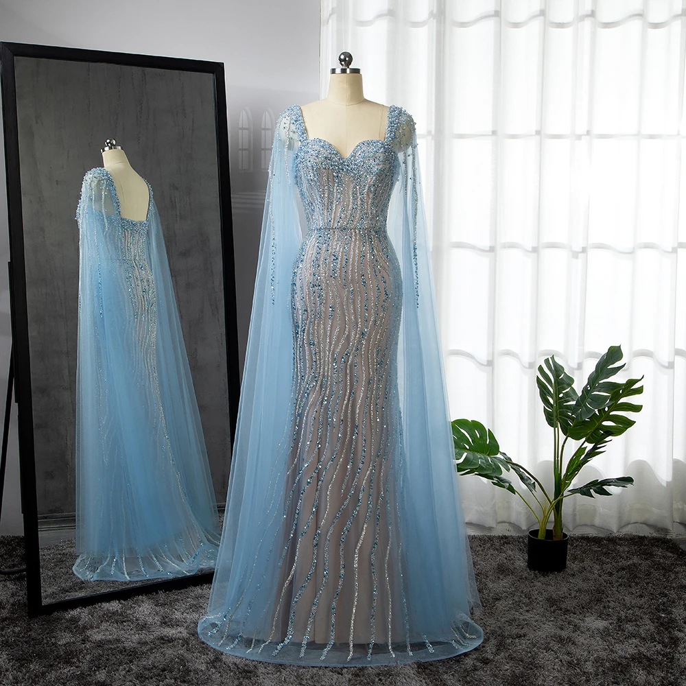 Serene Hill Blue Arabic Luxury Beaded Mermaid Cape Sleeves Sexy Evening Dresses Gowns 2023 For Women Wedding Party LA71715