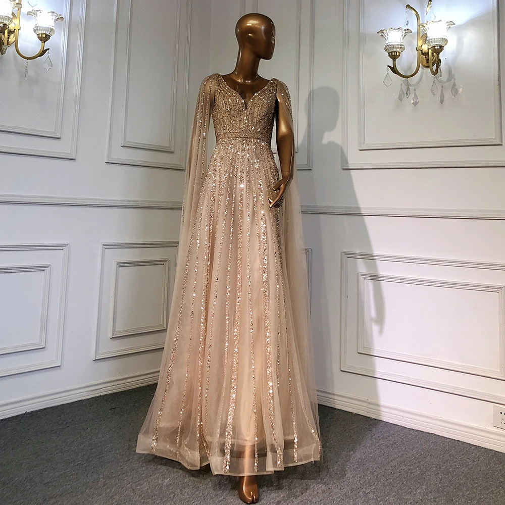 Serene Hill Nude Arabic Luxury Cape Sleeves Evening Dresses Gowns A-Line Beaded Sexy 2022 For Women Party LA71567