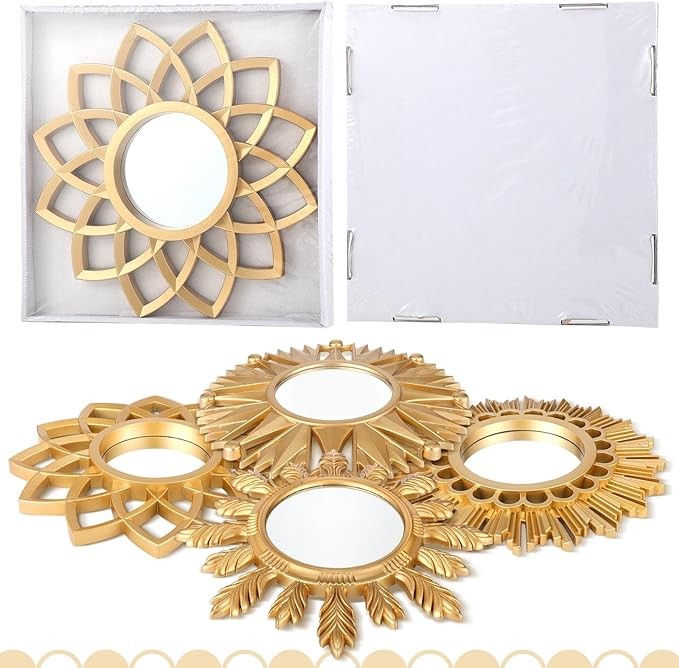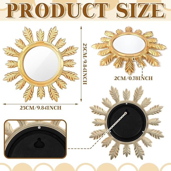 Gold Plastic Flower Mirrors: The gold flower mirrors for wall decor come in a pack of 4, which are about 9.84 x 9.84 x 0.79 inches with the PVC frame, the diameter of the glass is about 3.94 inches, allowing you to use the small round mirror to decorate several rooms, these decorative round mirrors are plastic frame and painted gold, ideal wall decor for living room, bedroom, hallway, lounge and office