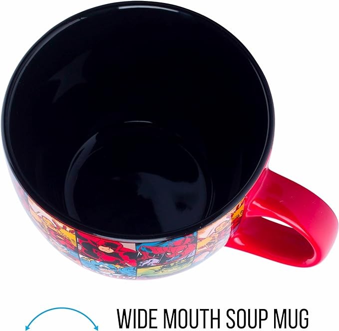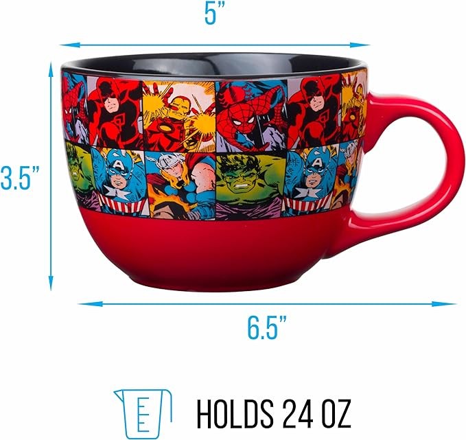 • YOUR FAVORITE MARVEL HEROES: Oversized 24 oz mug holds a ton of your favorite hot or cold beverage. Red mug features a grid of your favorite superheroes including Spiderman, Hulk, Ironman, Flash, Captain America and more.
