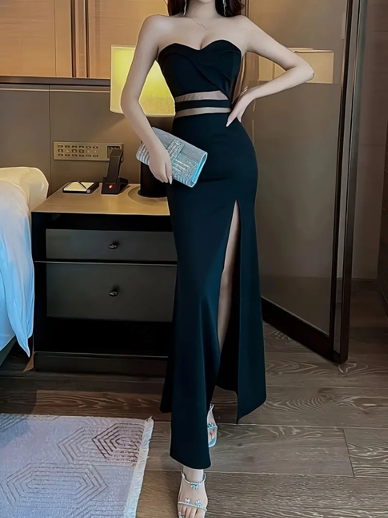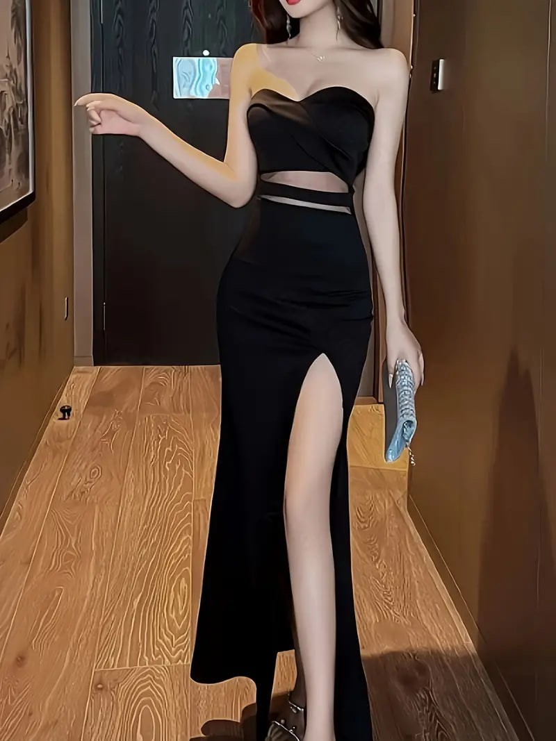 Solid Cut Out Split Thigh Tube Dress, Elegant Sleeveless Strapless Bodycon Dress, Women s Clothing details 0Solid Cut Out Split Thigh Tube Dress, Elegant Sleeveless Strapless Bodycon Dress, Women s Clothing details 0