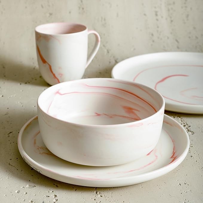 • 16 Piece Dinnerware Set – Cool pink porcelain dining sets. Trendy design. Includes 4 round dinner plates, 4 salad plates, 4 bowls and 4 mugs.