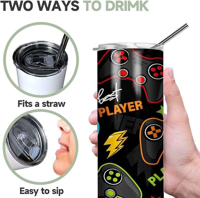 SupBo 20oz Skinny Tumbler With Lid and Straw, Gifts for Man, Dad Birthday Gifts, Travel Mug For Father, Stainless Steel, Double Wall, Vacuum Sealed Travel Mug (The Best Player Gamer)