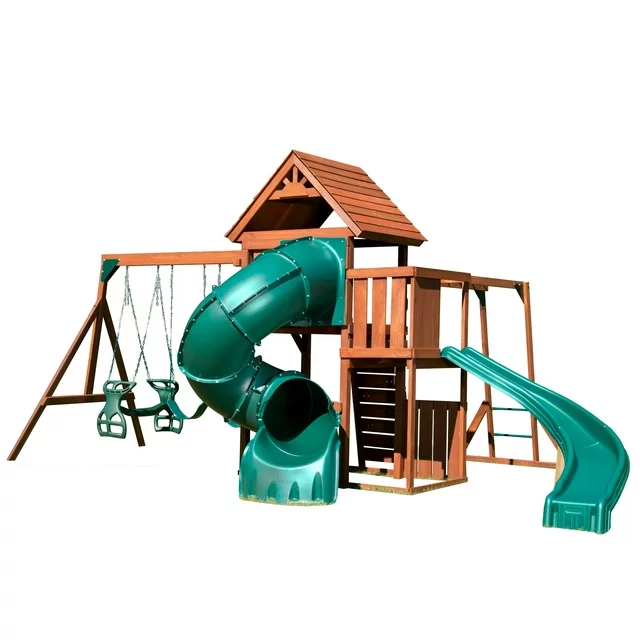 Swing-N-Slide Grandview Twist Wood Backyard Swing Set with Tube Slide, Curved Slide, Wood Roof, Monkey Bars and Swings