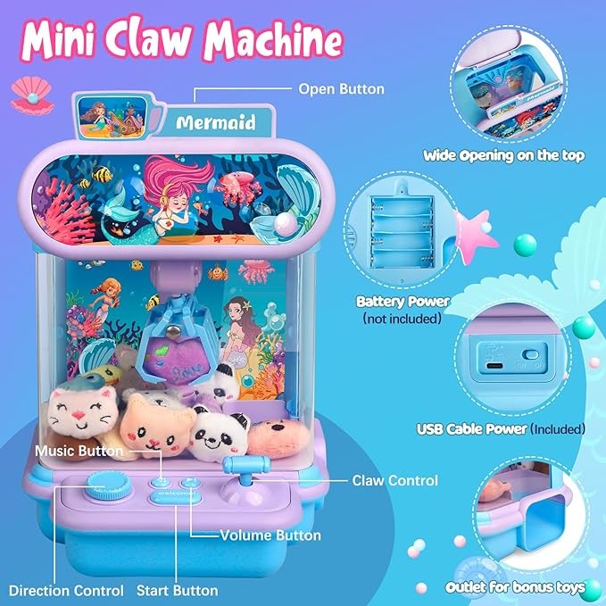 【Easy to Operate】 - Simply turn the switch on the back to the ON position. Then, press the 60-second time limit button and manipulate the joysticks up, right, left, or down to capture your chosen prize. The claw of this mermaid claw machine is both powerful and agile, capable of rotating 360 degrees to effortlessly secure the most magical rewards. Recommend putting 12-16 mini plush toys at a time to avoid overcrowding.
