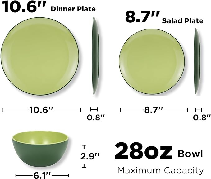 Dinner Service for 4: TP creative and healthy avocado green dishes set with brilliant glow, includes 4 of each - 28 oz bowls, 10.6’’ dinner plates, 8.7” salad/dessert plates.