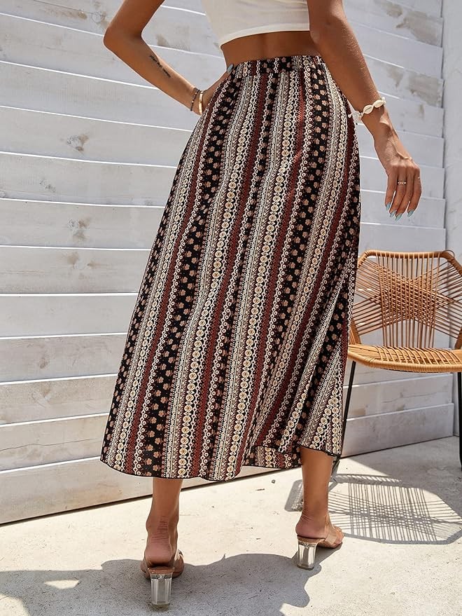 Verdusa Women's High Split Tribal Print Striped Boho Elastic Waist Long Skirt