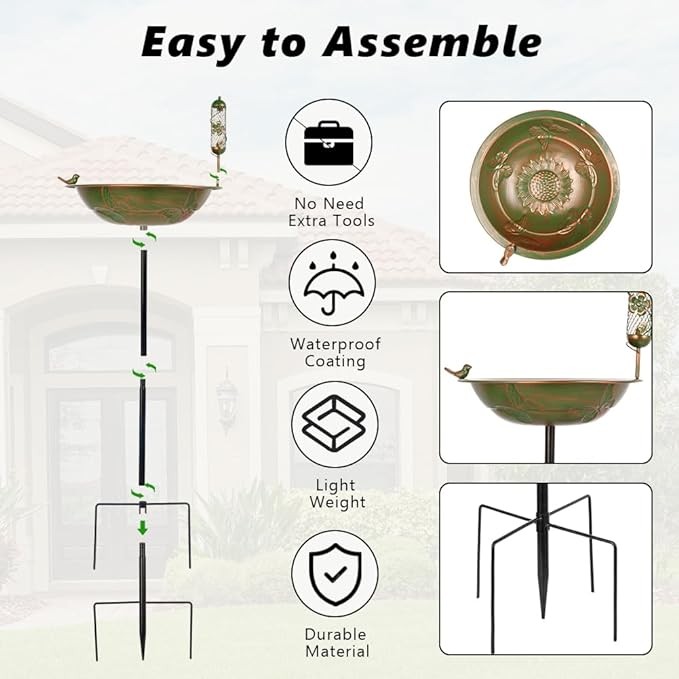 DURABLE MATERIAL: Our bird baths for outdoors are made of high quality metal materials and coverd with safety coating on the surface. Sturdy and durable, windproof and rainproof, not easy to rust, environmentally friendly, no pungent smell, no need to worry about hurting your feathered friends.