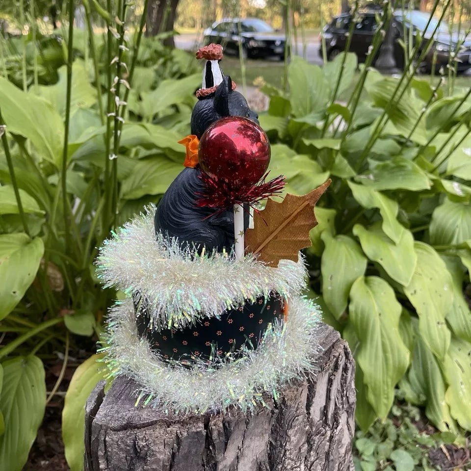 Hand made Halloween themed assemblage. Cute black cat holding a candy pail. About 9.5 in tall