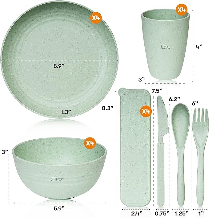 Multipurpose Dinnerware - Our reusable dishes set for 8 are made for every occasion and will not only be great for home and kitchen use, but also convenient for an rv or camper, a picnic, BBQing, camping, work, school and much more. The unique design allows for easy compact storage as well. You can't go wrong with our wheatstraw dinnerware set.