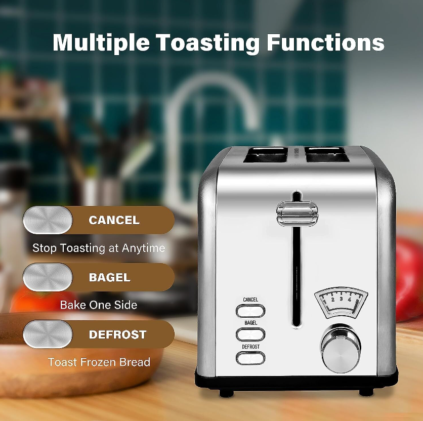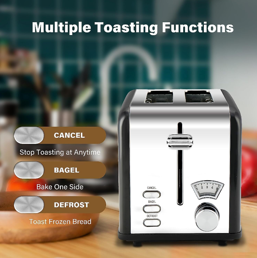 • Customize Toast: Use the shade selector to make 5 kinds of lighter to darker toast. 3 functions meet your various toast needs: "Bagel" bake only one side, "Defrost" make frozen bread soft, "Cancel" helps you stop at any time.