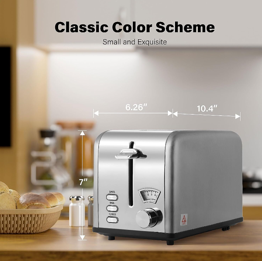 • Compact and Exquisite: Measuring Length 10.4"*Width 6.26"*Height 7", the toaster occupies a small area and fits perfectly into every corner of the kitchen.